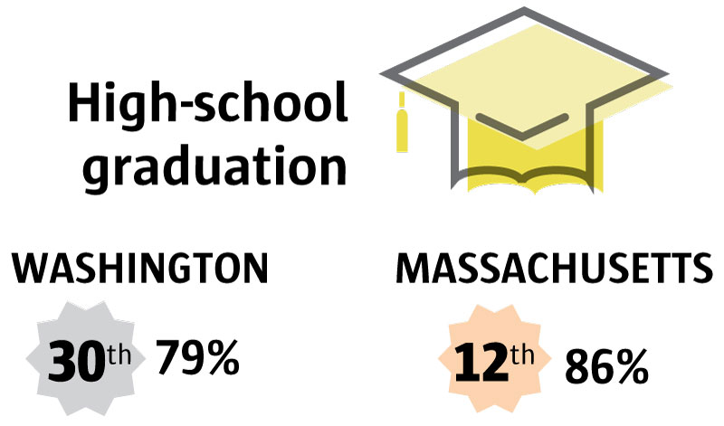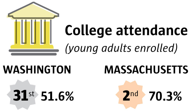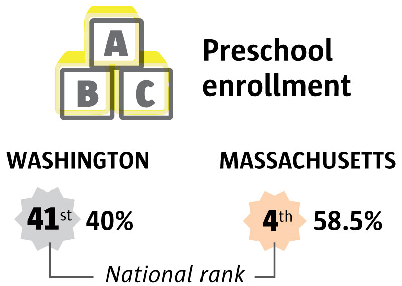 Massachusetts, which has a population similar to Washington’s, outperforms us on a variety of school measures. Our students test fairly well. But in preschool enrollment, high school graduation and college attendance, we are well below the national median.